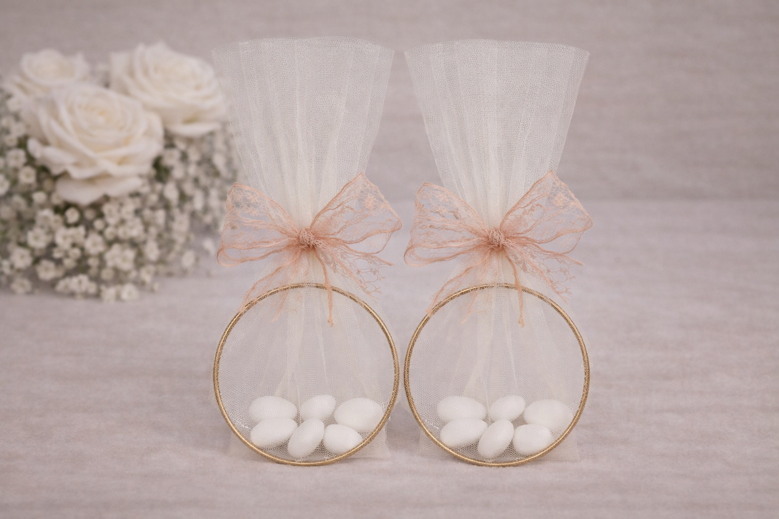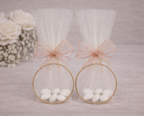 Μπομπονιέρα γάμου τούλινη με χρυσό κρίκο