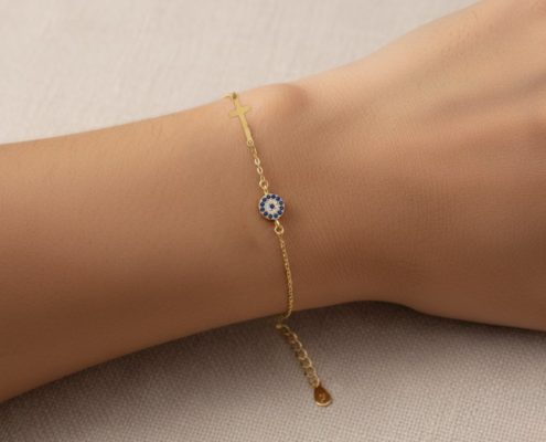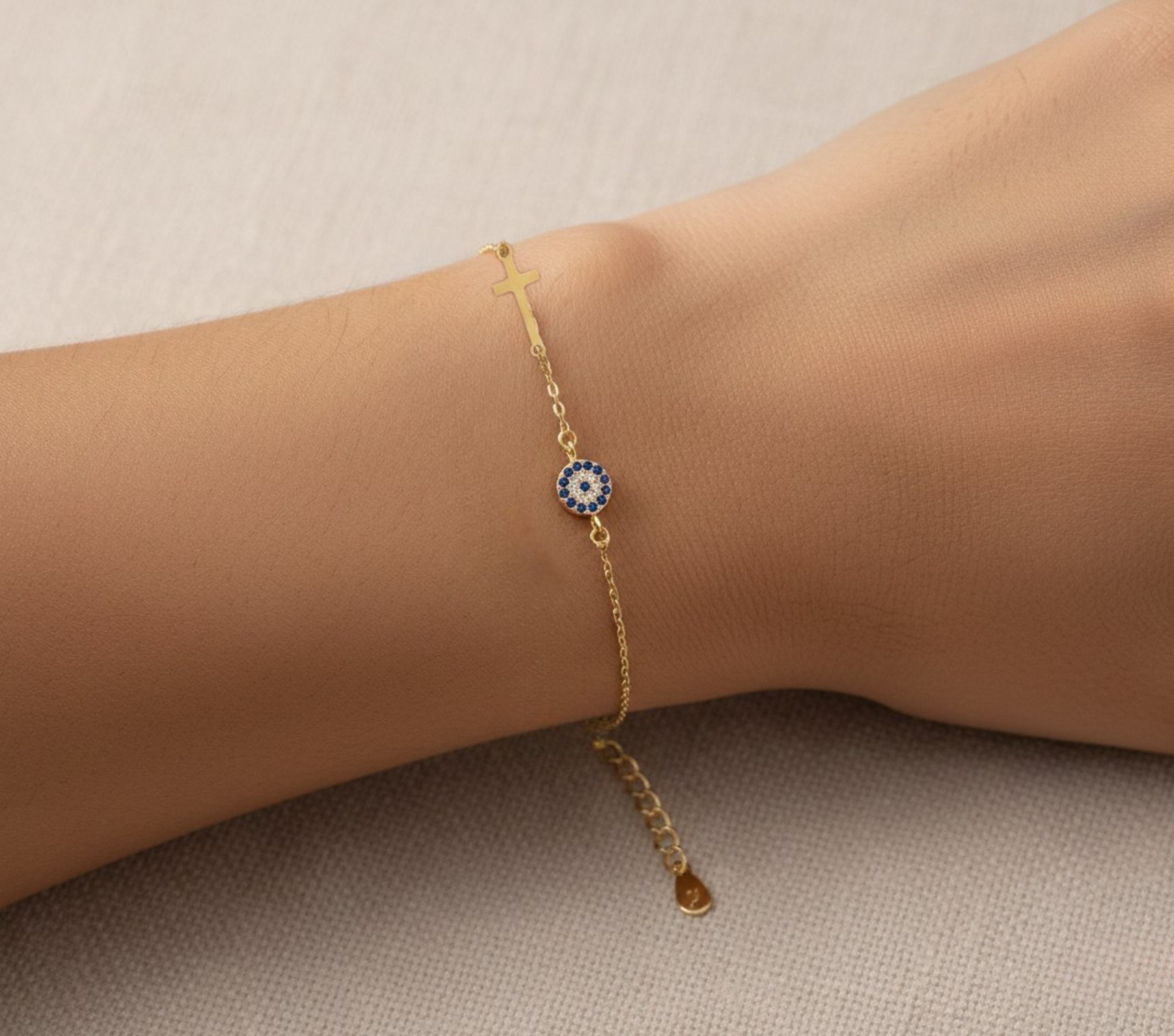 Ασημένιο γυναικείο βραχιόλι με ματάκι και σταυρό από ασήμι 925. Κομψό και διαχρονικό κόσμημα για κάθε περίσταση.