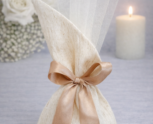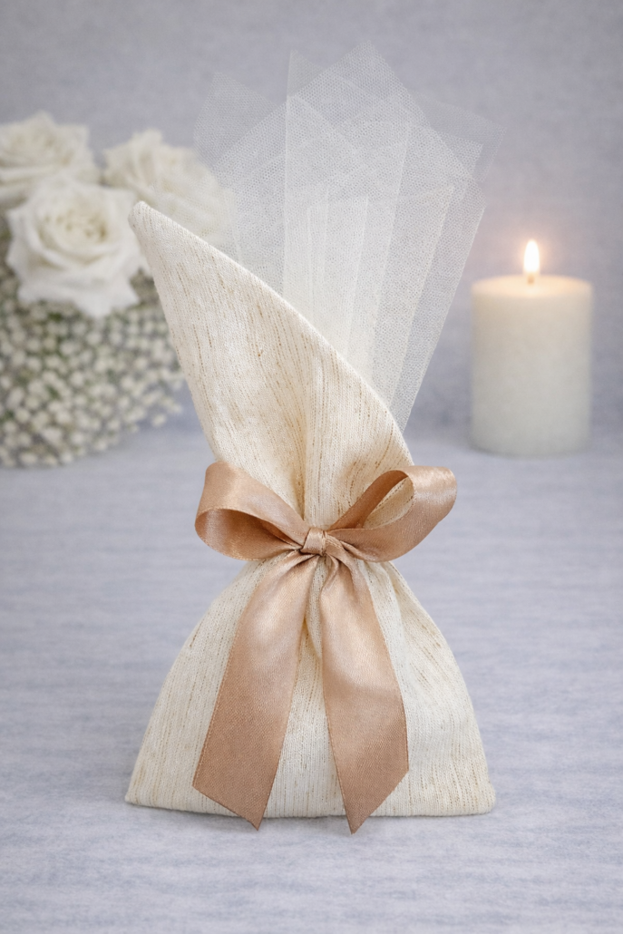 Η μπομπονιέρα είναι κατασκευασμένη από εκρού τούλι υψηλής ποιότητας και δένεται με σατέν κορδέλα σε σαμπανιζέ απόχρωση, δημιουργώντας ένα elegant αποτέλεσμα που ταιριάζει σε κάθε στυλ γάμου.