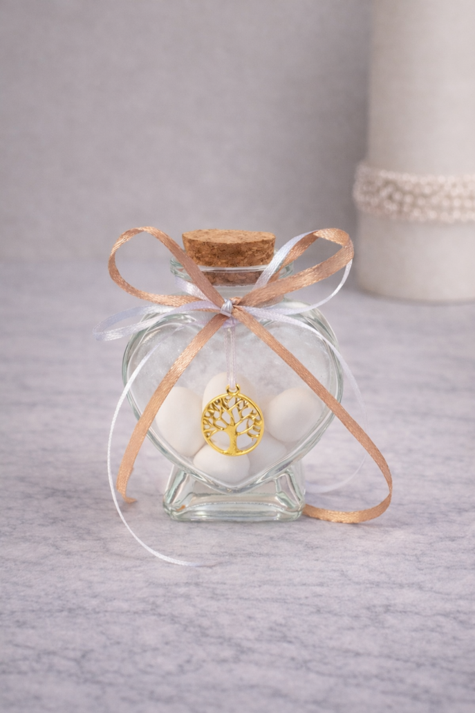 Ρομαντική και συμβολική μπομπονιέρα γάμου σε γυάλινο βαζάκι σε σχήμα καρδιάς, με φελλό και διακόσμηση από σατέν κορδέλες.