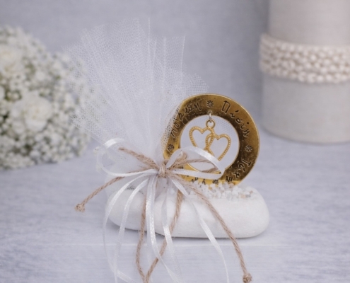 Μπομπονιέρα Γάμου Βότσαλο με Χρυσό Διακοσμητικό Διπλή Καρδιά