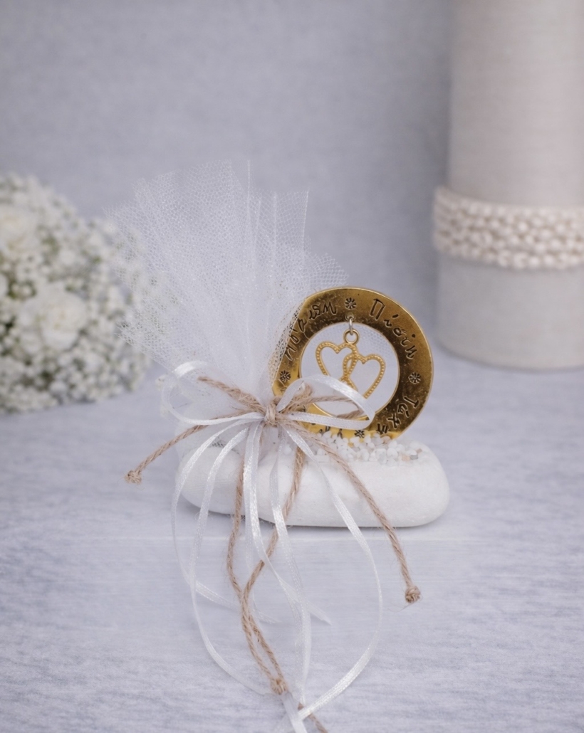 Κομψή μπομπονιέρα γάμου σε λευκή διακοσμητική πέτρα με χρυσό κύκλο με ευχές, διακοσμημένη με φίνο τούλι, σπάγκο και χρυσό μεταλλικό στοιχείο διπλής καρδιάς.