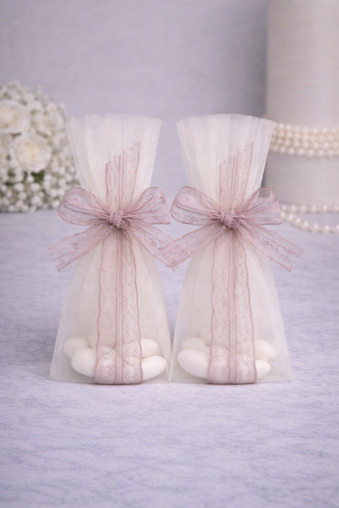 Ρομαντική μπομπονιέρα γάμου τούλινη, διακοσμημένη με κάθετη ροζ δαντελένια κορδέλα και ασορτί φιόγκο.
