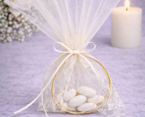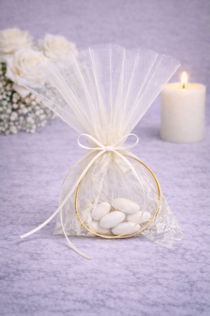 Κομψή μπομπονιέρα γάμου από φίνο εκρού τούλι με διακριτική δαντελένια λεπτομέρεια και χρυσό μεταλλικό κρίκο στο κάτω μέρος.
