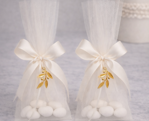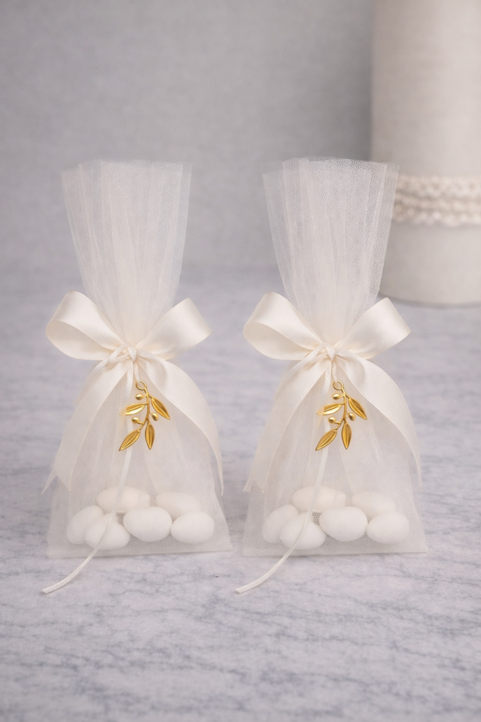 Ρομαντική και διαχρονική μπομπονιέρα γάμου τούλινη, δεμένη με σατέν φιόγκο και διακοσμημένη με χρυσό κλαδί ελιάς.