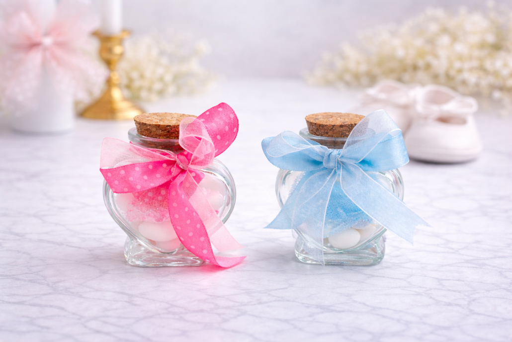 Ρομαντική μπομπονιέρα βάπτισης σε γυάλινο βαζάκι σχήμα καρδιάς με φελλό. Διακοσμείται με σατέν και πουά κορδέλα σε ροζ ή γαλάζια απόχρωση, δημιουργώντας ένα κομψό και χαριτωμένο αποτέλεσμα.