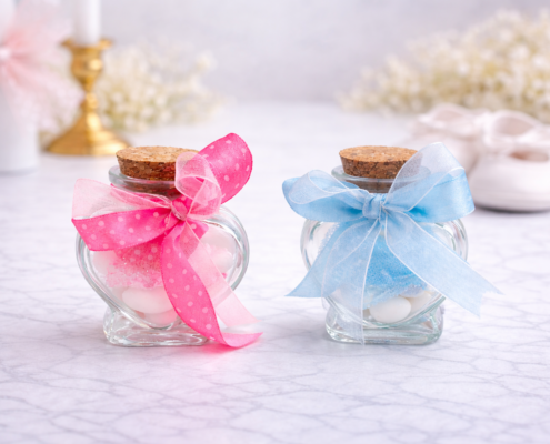 Μπομπονιέρα Βάπτισης Γυάλινο Βαζάκι Καρδιά Ροζ ή Γαλάζιο