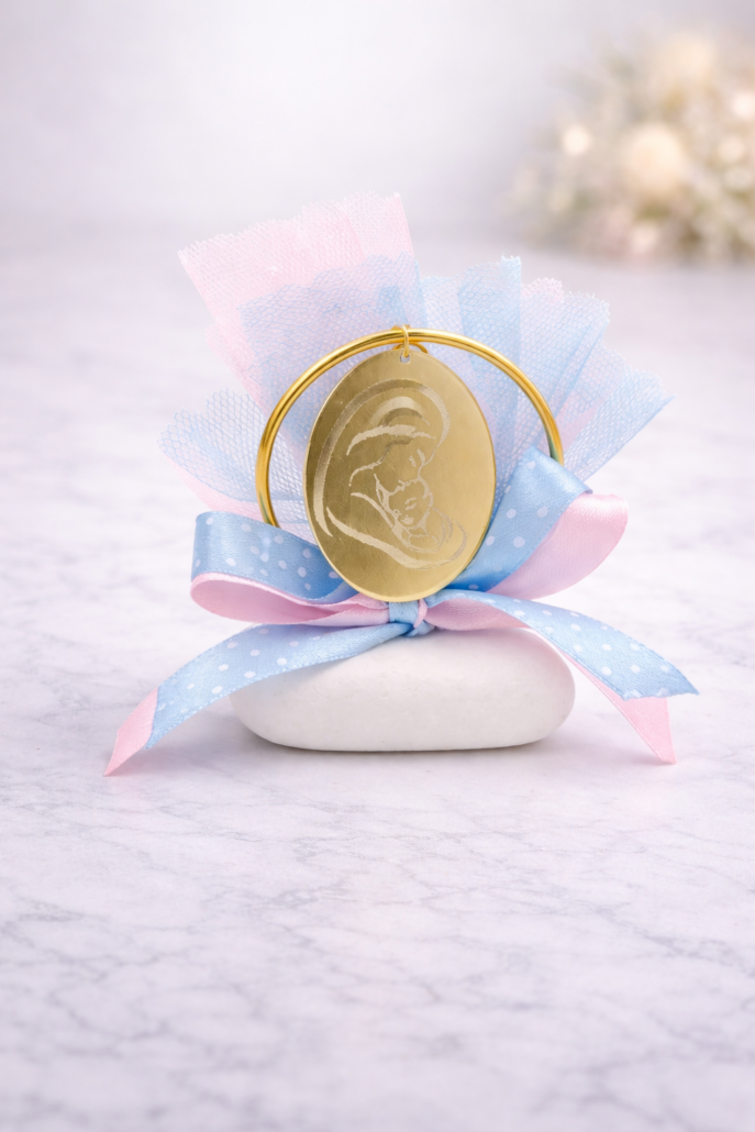 Κομψή και συμβολική μπομπονιέρα βάπτισης με βότσαλο, διακοσμημένη με μεταλλική εικόνα Παναγίας σε χρυσό τόνο. Το στοιχείο πλαισιώνεται από διακριτικό μεταλλικό κύκλο και τούλι σε ροζ και γαλάζιες αποχρώσεις, ολοκληρωμένο με σατέν κορδέλες.
