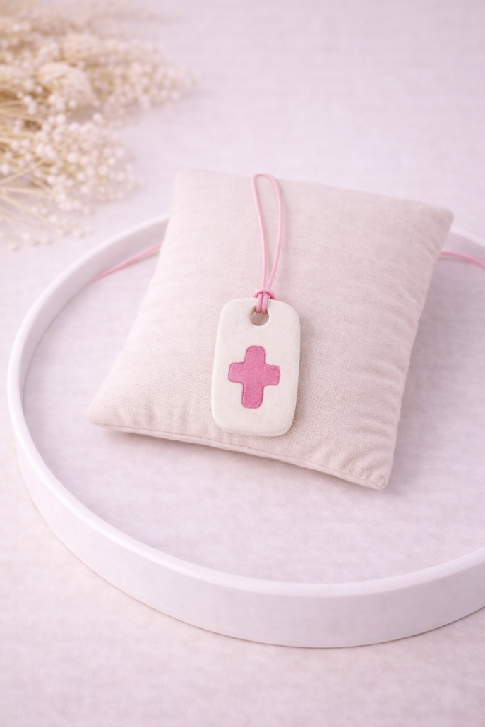 Κεραμικό μαρτυρικό βάπτισης σε minimal αισθητική, με ορθογώνιο κεραμικό στοιχείο και ροζ σταυρό. Συνοδεύεται από ροζ κορδόνι για εύκολη τοποθέτηση.