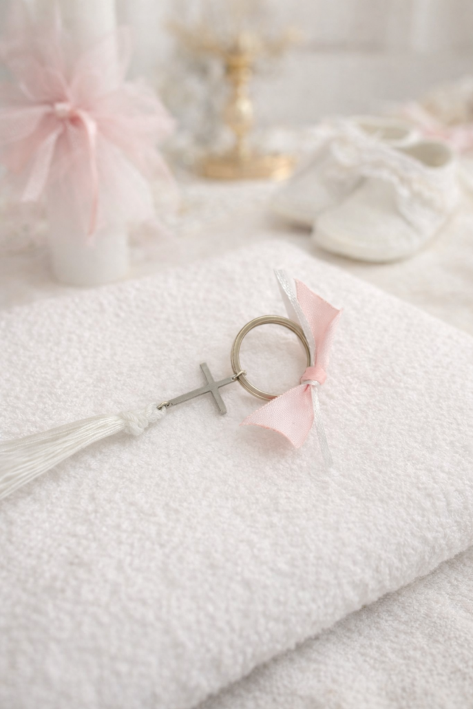 Ένα κομψό και διαχρονικό αναμνηστικό δώρο για τους καλεσμένους, ιδανικό για βάπτιση κοριτσιού. Ο συνδυασμός του σταυρού με τις απαλές αποχρώσεις δημιουργεί ένα εκλεπτυσμένο και συμβολικό αποτέλεσμα.