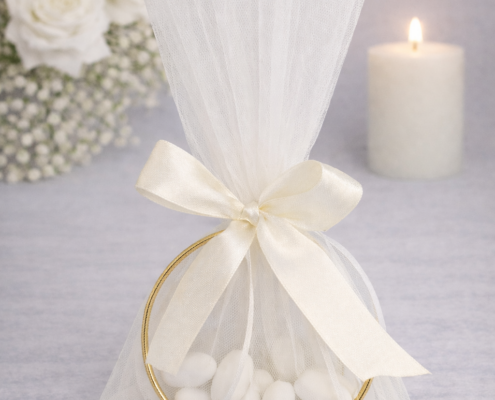 Ο λιτός και ρομαντικός σχεδιασμός της δημιουργεί ένα κομψό αποτέλεσμα που ταιριάζει ιδανικά σε κλασικούς, minimal ή elegant γάμους. Στο εσωτερικό της μπομπονιέρας τοποθετούνται κουφέτα, ενώ ο χρυσός κρίκος προσθέτει μια διακριτική πινελιά πολυτέλειας.