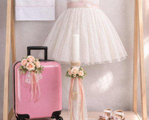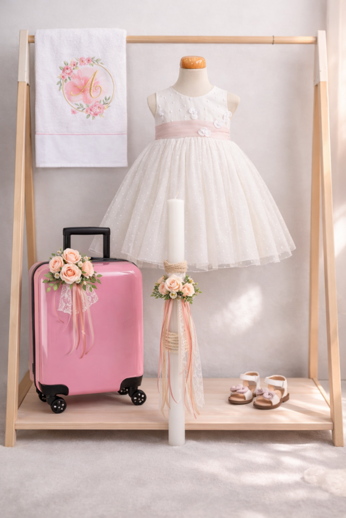Ένα ολοκληρωμένο πακέτο βάπτισης κοριτσιού που συνδυάζει κομψότητα, ποιότητα και ρομαντική αισθητική για μια ημέρα γεμάτη συναίσθημα.