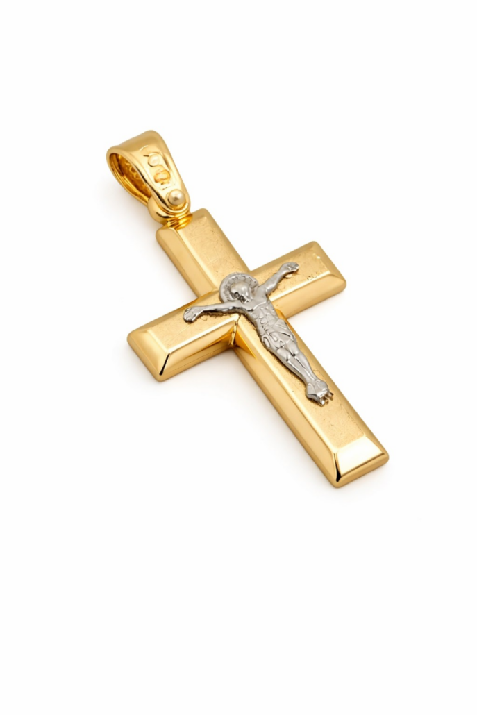 Βαπτιστικός σταυρός με εσταυρωμένο σε δίχρωμο σχεδιασμό που συνδυάζει την παράδοση με την κομψότητα.