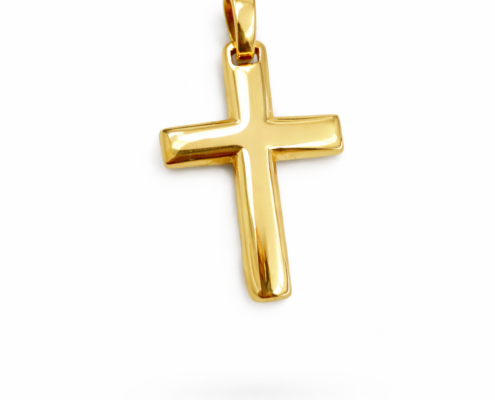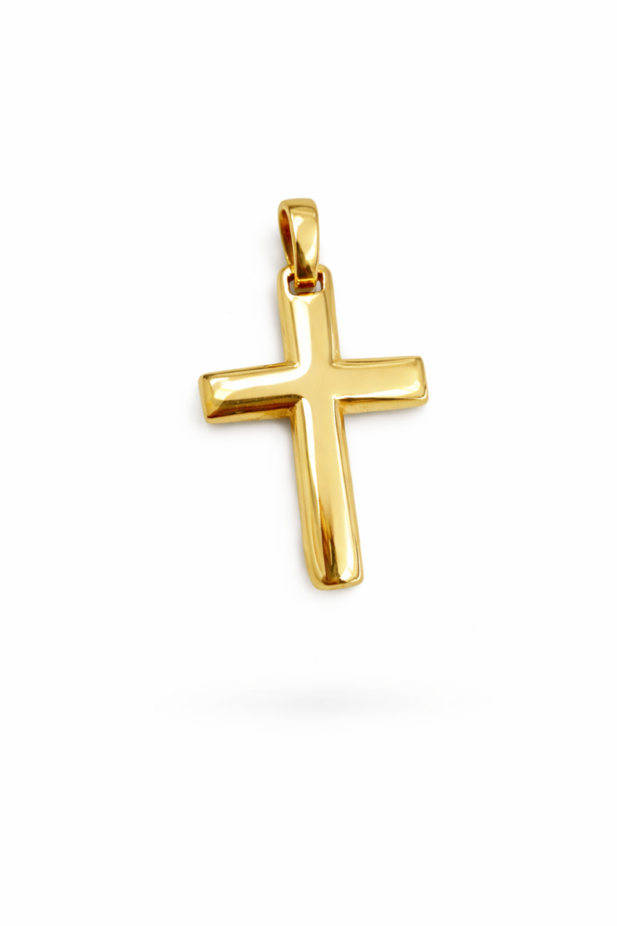 Χρυσός βαπτιστικός σταυρός με λουστρέ φινίρισμα και καθαρές γραμμές που αναδεικνύουν τη διαχρονική κομψότητα του κοσμήματος.