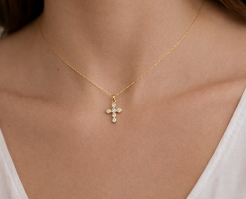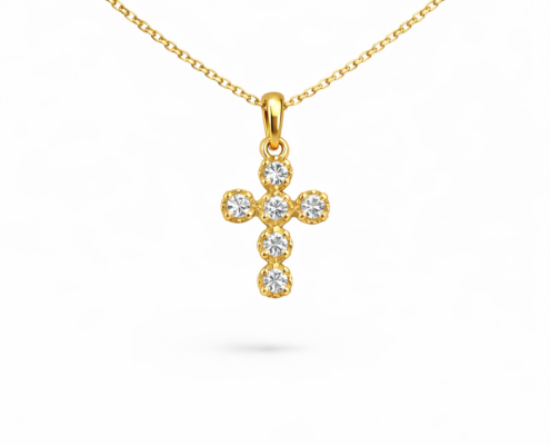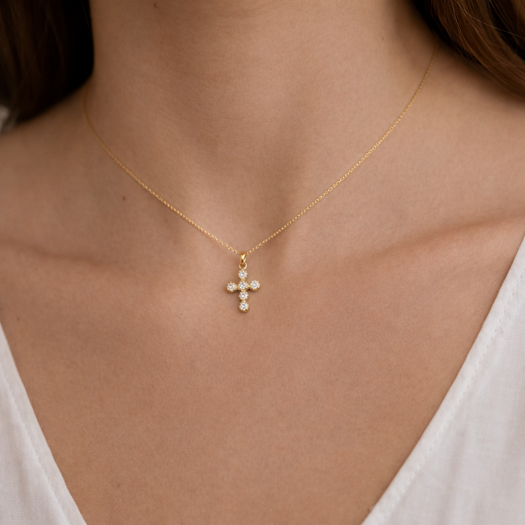 Κομψός σταυρός διακοσμημένος με λαμπερές πέτρες ζιργκόν που χαρίζουν διακριτική λάμψη και πολυτέλεια.
